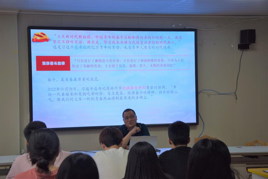 龐繼偉以《總書記的青年觀》為題,帶領同學們學習領悟習近平總書記的“青年觀”,向同學們講述了習近平總書記高度重視青年和青年工作的事例,重點解讀了總書記對億萬青年的寄語,并以我校優秀畢業生為例,引領同學們深刻感悟總書記對青年成長和青年工作的關心。