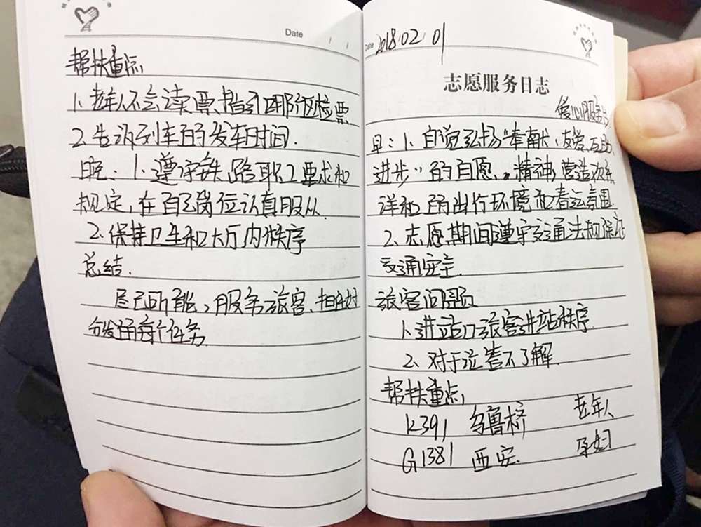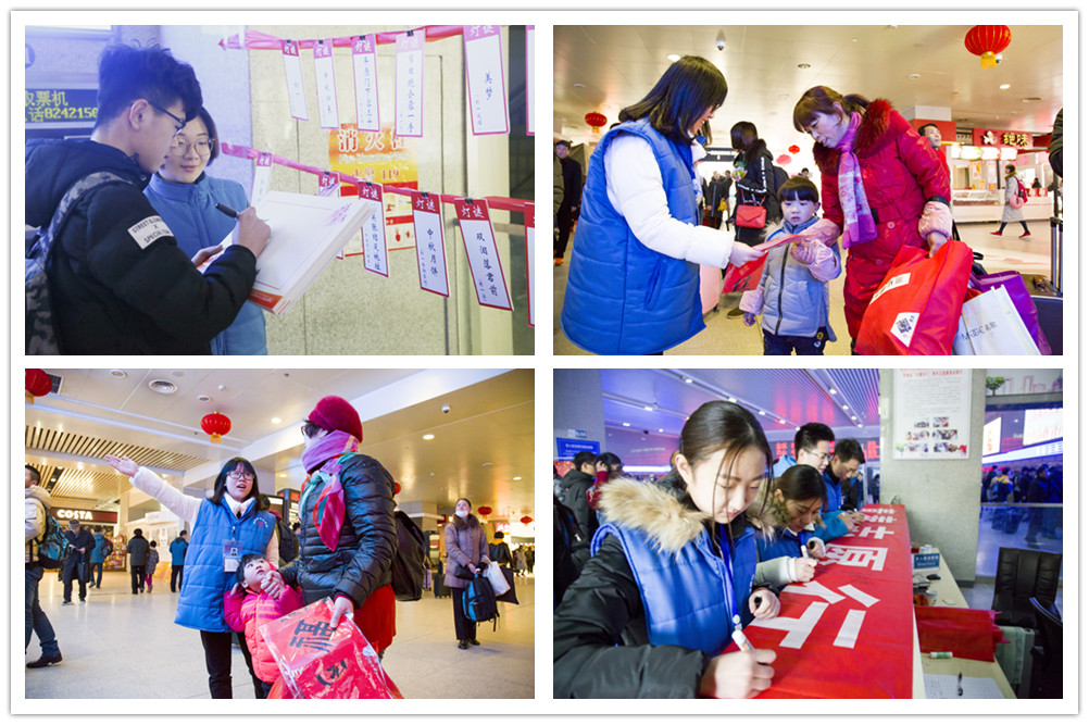 “這么冷的天,還有志愿者幫我拿行李,給我送福字、倒姜湯,心里特別暖和。”“車站人太多,快上火車了,突然發現錢包掉了,幸虧志愿者及時發現,為他們的細心和誠信點贊。”在“藍精靈”進行志愿服務的30天里,每天都有美好、動人故事發生,得到“精靈”們幫助的旅客,也都會用這種溫暖的話語對可愛的“藍精靈”表示贊美與感謝。
