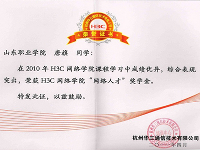 3.“H3C網絡學院”獎學金和貧困生助學金。杭州華三通信技術有限公司每年提供1500元的H3C網絡學院“網絡人才獎學金和1000元的“貧困生助學金”獎勵在H3C特色班學習中成績優異、品學兼優、表現突出的學生。