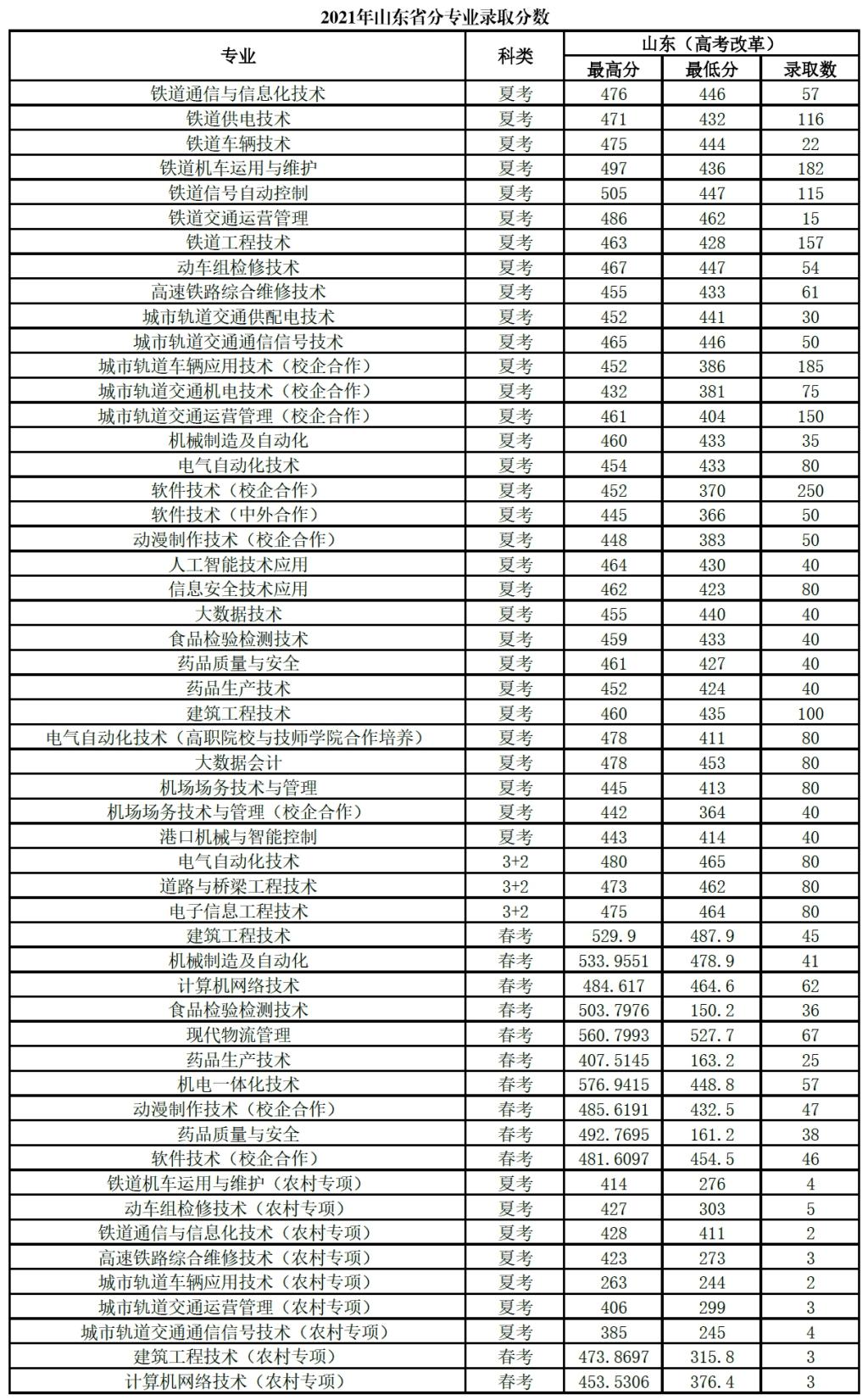 山東職業學院2021年山東省及外省錄取分數
