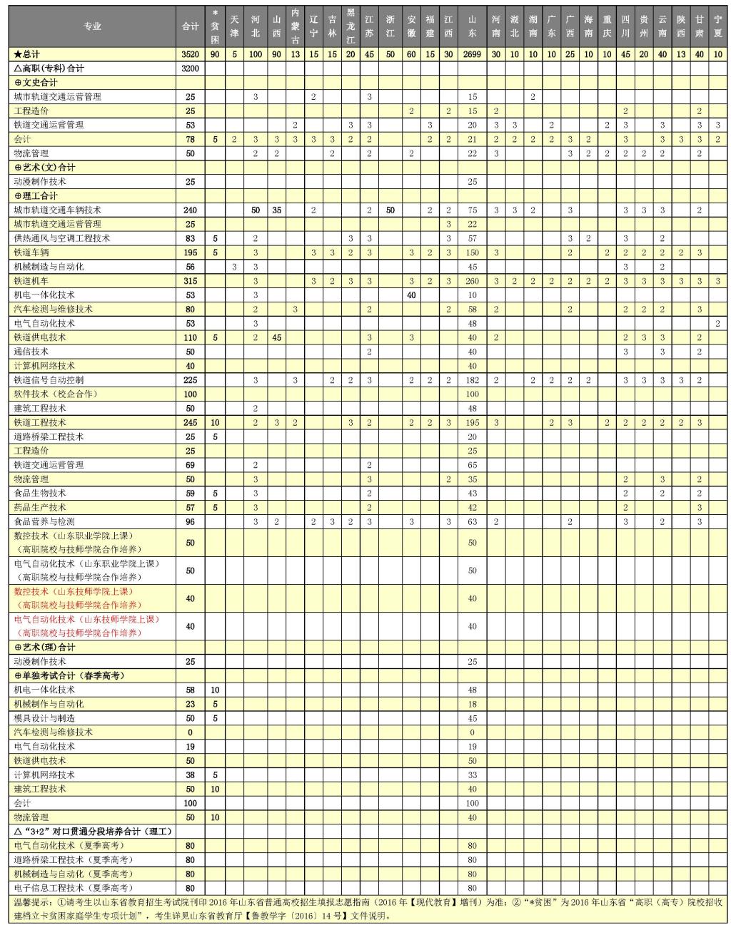 山東職業學院2016年招生計劃