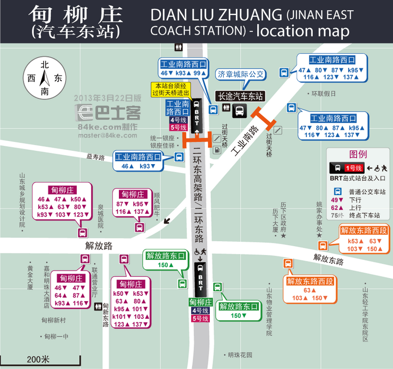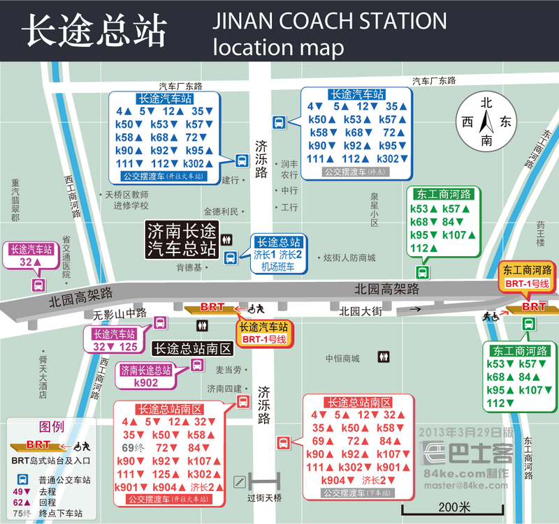 在站外濟濼路路西的【長途汽車站】乘K68到【千佛山】下,原地換乘K301路到【埠東村】下。