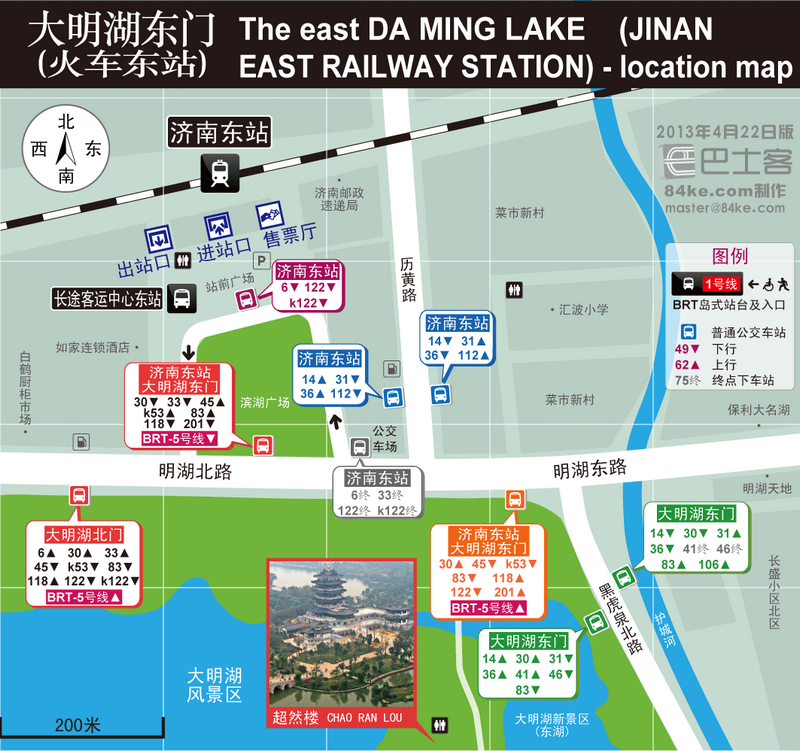 在站外路南的【大明湖東門】乘118路、BRT_5號線到【洪家樓】下,前行150米換乘311路到【埠東村】下;或在歷黃路路西的【濟南東站】乘31路到【山大路南口】下,原地換乘K301路到【埠東村】下。