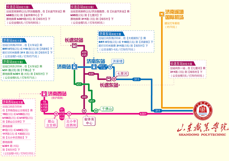在出站口西南200米的【火車站】乘BRT_5號線到【洪家樓】下,前行150米換乘311路到【埠東村】下;或在火車站廣場東200米車站東街的【火車站】乘K51到【千佛山】下,原地換乘K301路到【埠東村】下。特別提示:每年9月新生報到時間,學院有專車在火車站接送,敬請留意車站廣場提示。